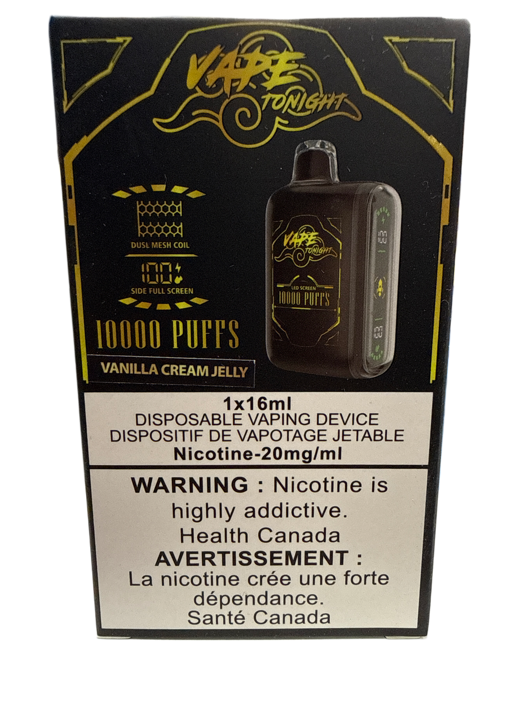 Experience the Vape Tonight Vanilla Cream Jelly, delivering up to 10,000 puffs with a smooth 20mg nicotine strength. This device combines a rich vanilla cream flavor with subtle jelly undertones, offering a consistent and satisfying vape. Designed for extended use, it ensures reliable performance and a refined taste profile for discerning users seeking both longevity and flavor complexity.